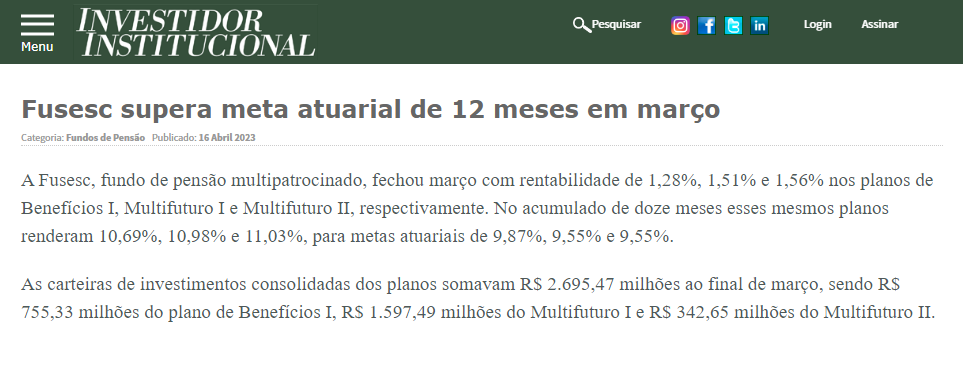 Notícia publicada na Revista Investidor Institucional em 16/04/2023.