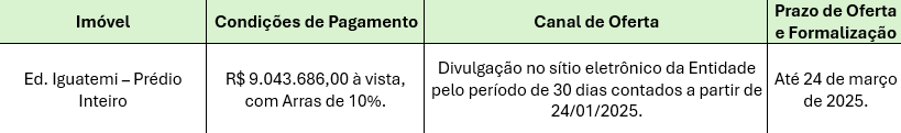 Em reunião realizada em 23/01/2025, o Conselho Deliberativo da Entidade aprovou a oferta de venda Edifício Iguatemi pelo valor de R$ 9.043.686,00 através de publicação no site da Entidade, pelo valor à vista, com formalização até 24/03/2025.