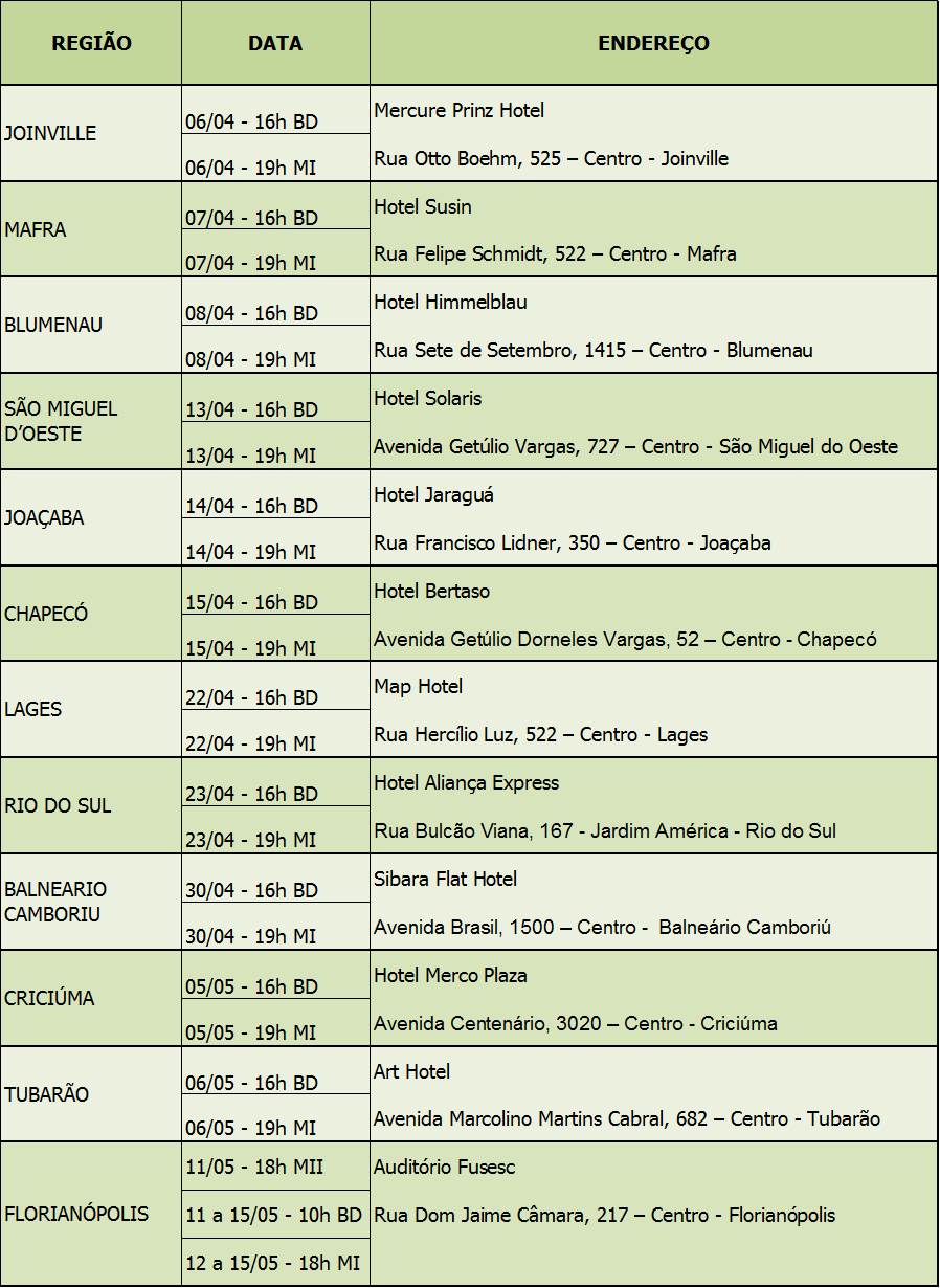 Neste ano, a Diretoria irá realizar as reuniões por plano de benefícios, percorrendo 12 cidades. Outra novidade é que, em Florianópolis, as reuniões ocorrerão no Auditório da Fusesc, portanto, devido a limitação de espaço, haverá mais datas disponíveis para possibilitar a participação de todos.