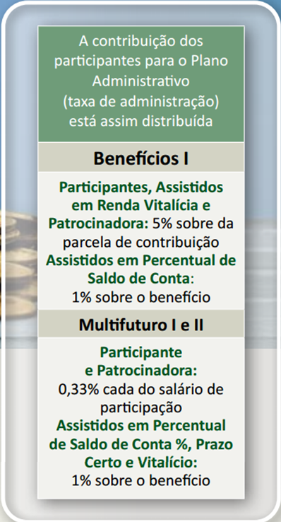 As despesas com a administração e pessoal, de acordo com a legislação vigente, são cobertas pela soma da parcela das contribuições destinadas a este fim e da rentabilidade do patrimônio do Plano Administrativo, que tem a finalidade de gerir as despesas administrativas.